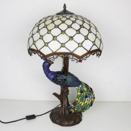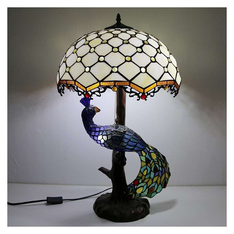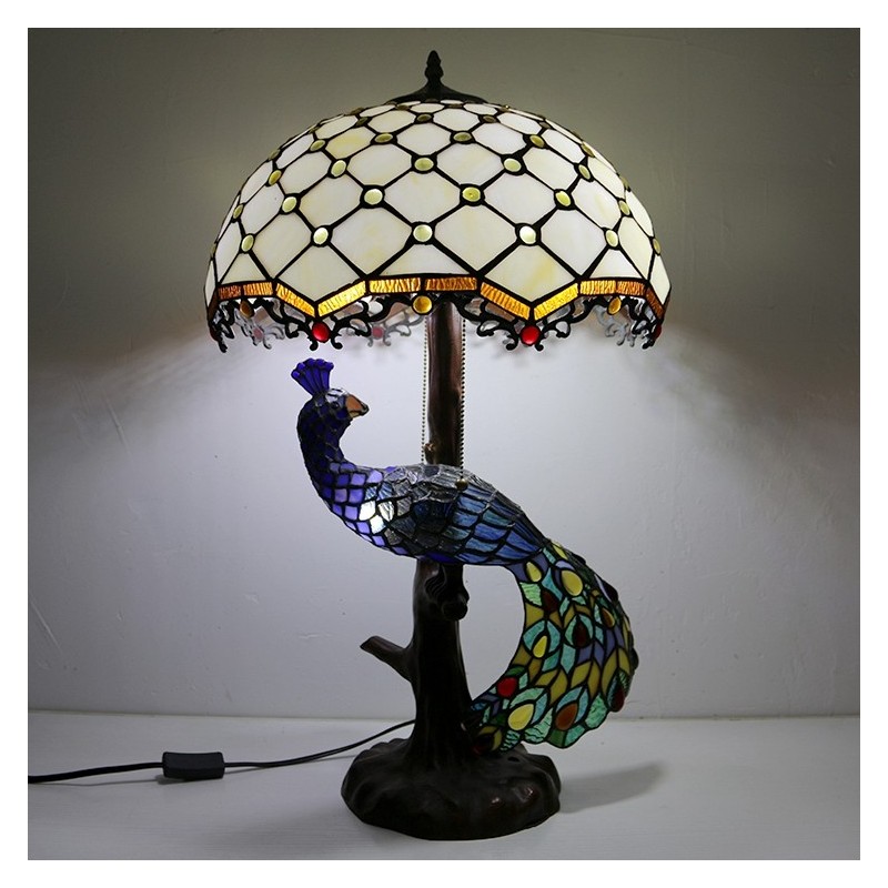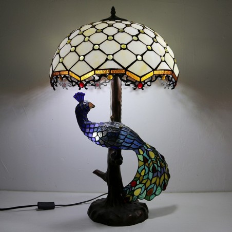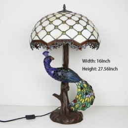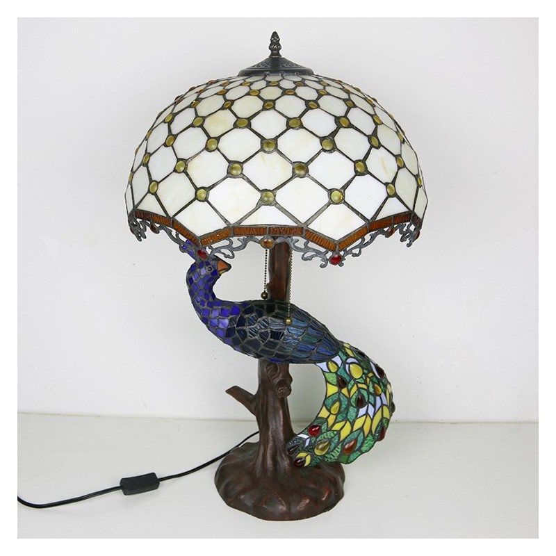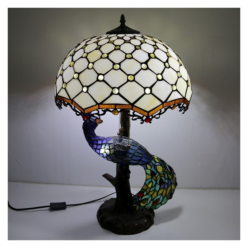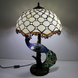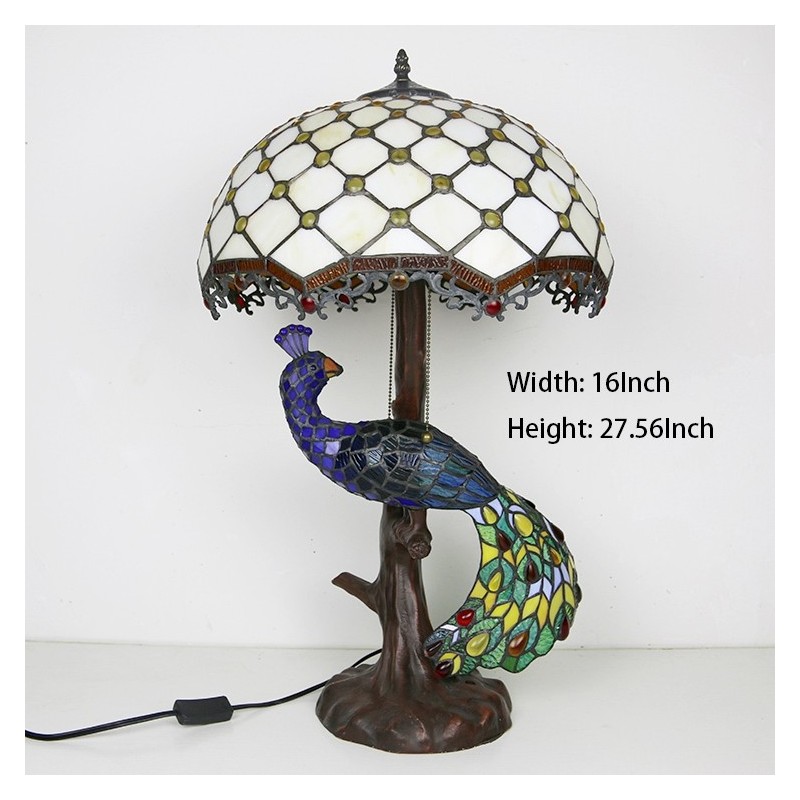 Tiffany stila galda lampa ar pāva pamatni, 16 collu antīkas baltas krelles, vitrāžas, lampas galda apgaismojums