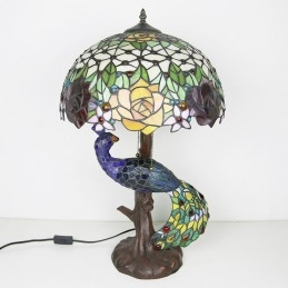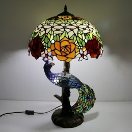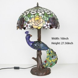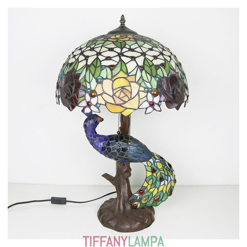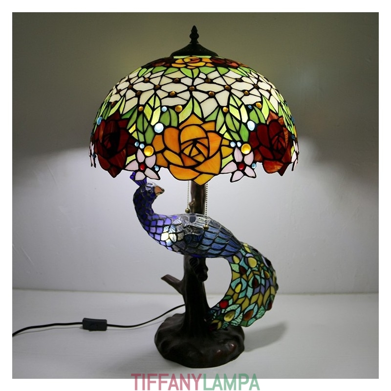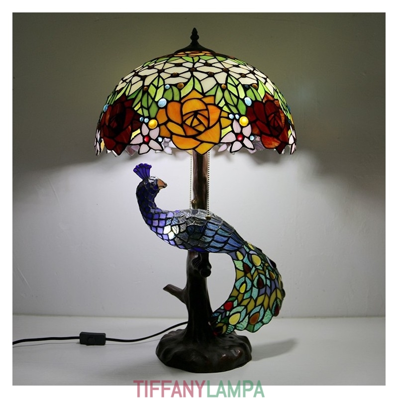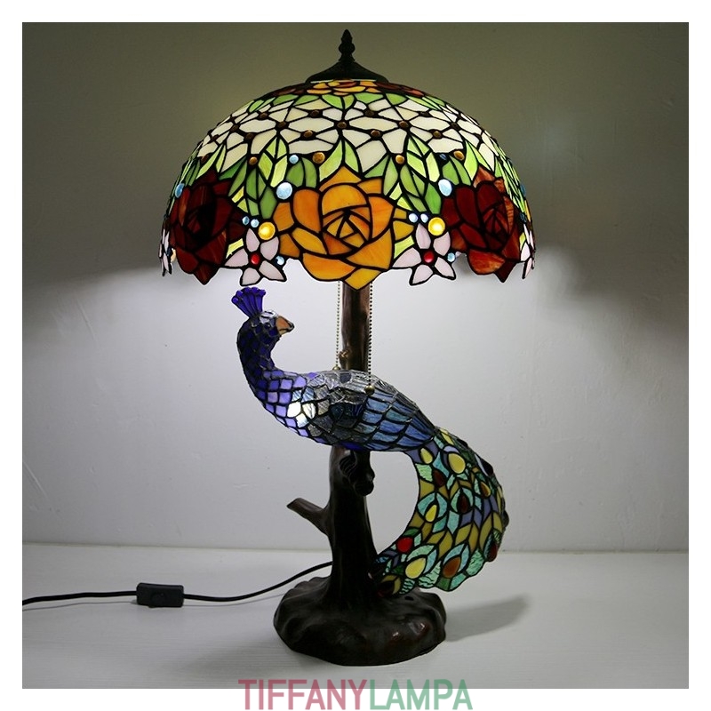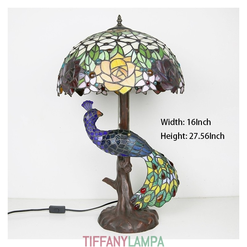 Tiffany stila galda lampa ar pāva pamatni 16 collu antīkas rožu ziedu vitrāžas lampas galda apgaismojums