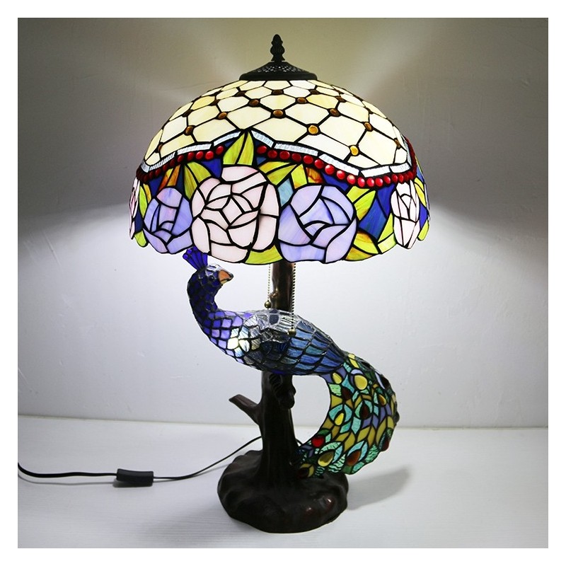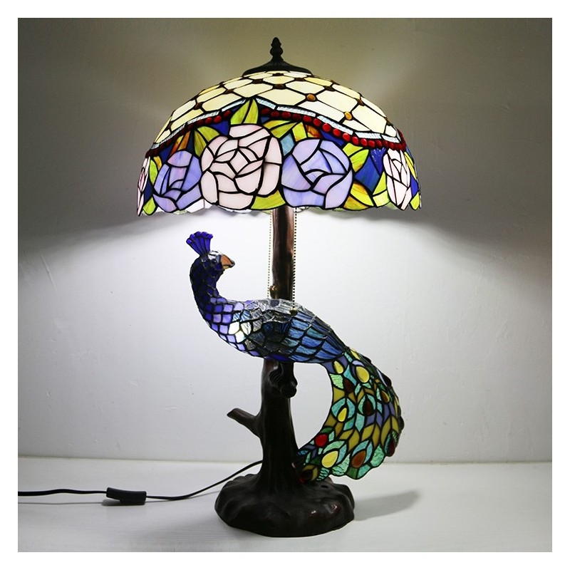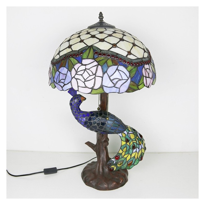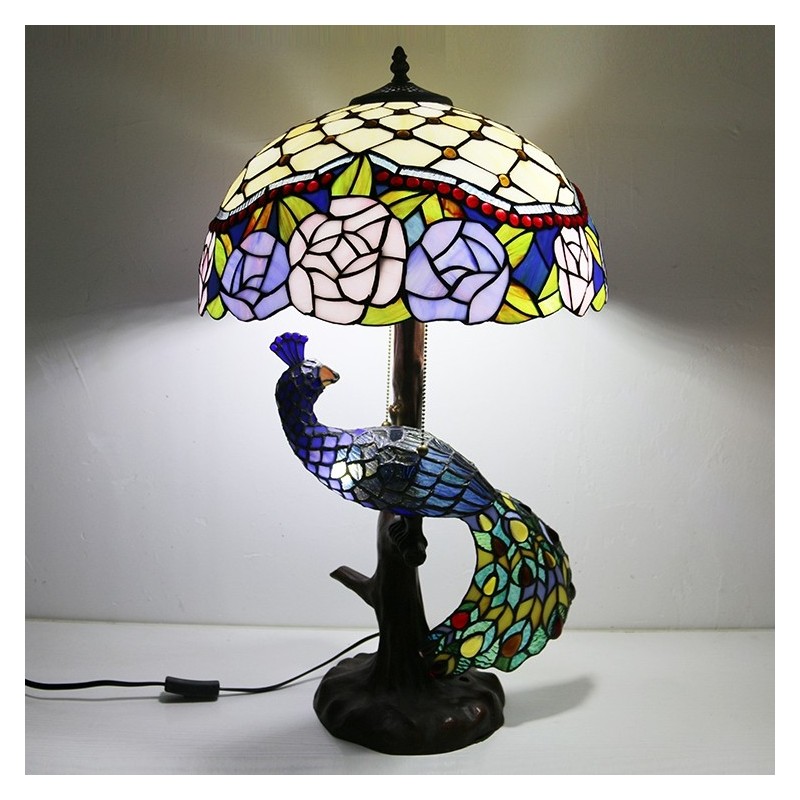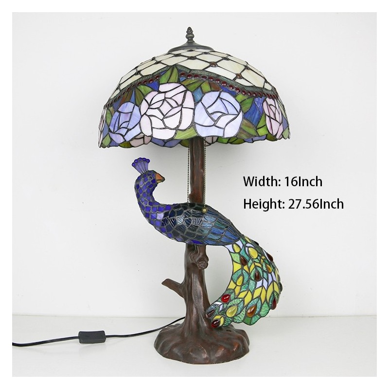 Tiffany stila galda lampa ar pāva pamatni 16 collu antīks florists vitrāžas lampas galda apgaismojums