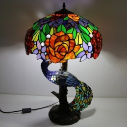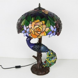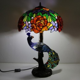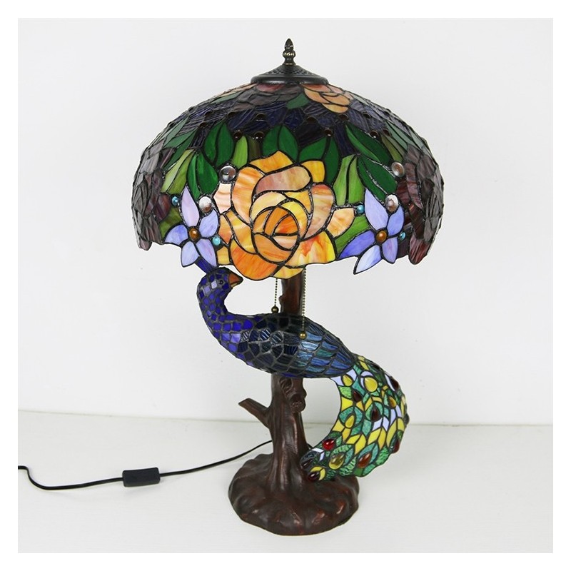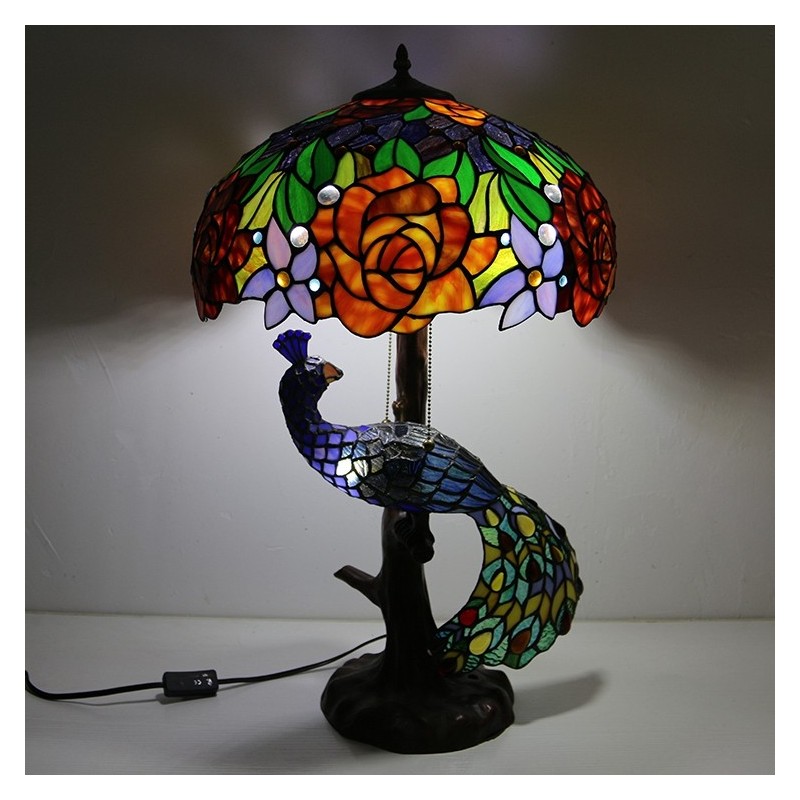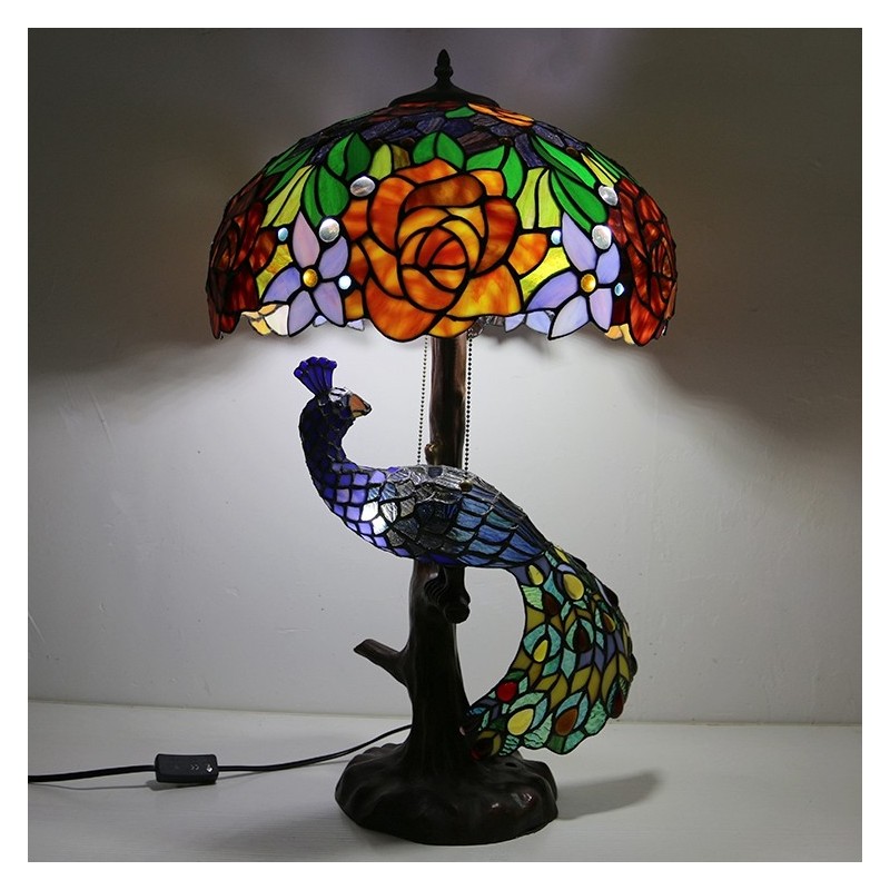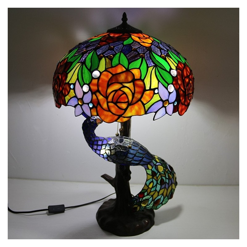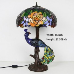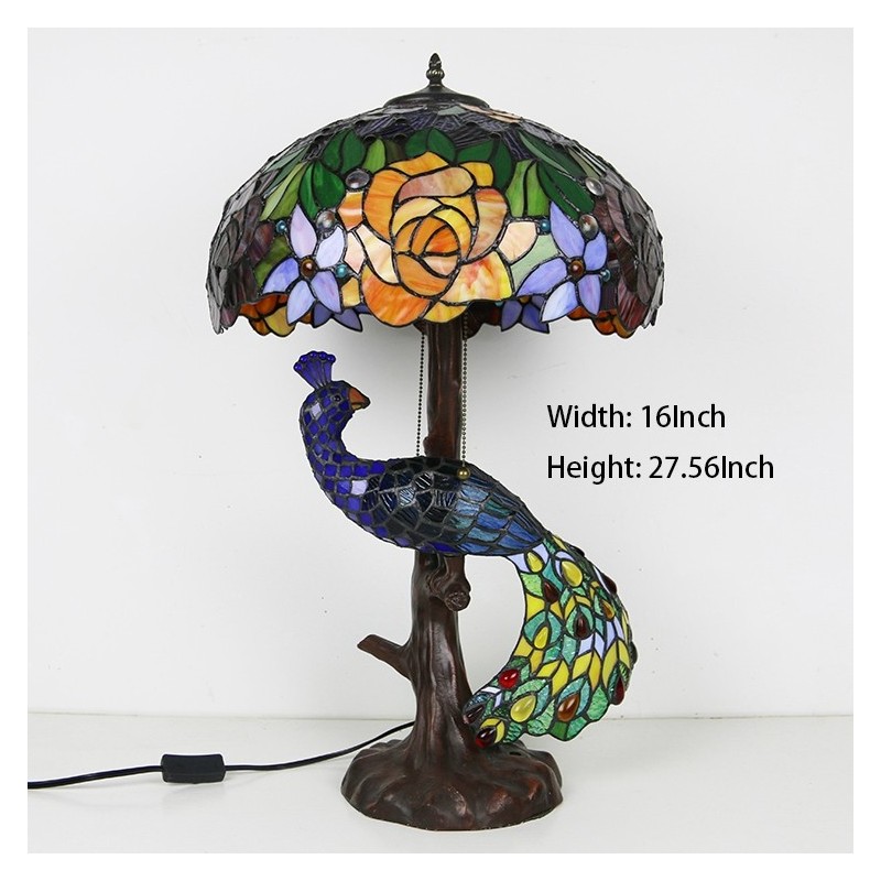 Tiffany stila galda lampa ar pāva pamatni 16 collu antīka rozā vitrāžas lampas galda apgaismojums