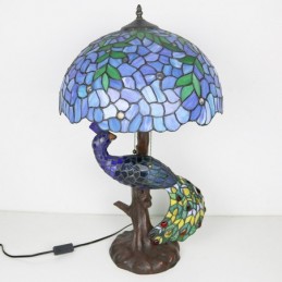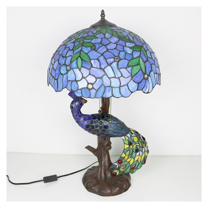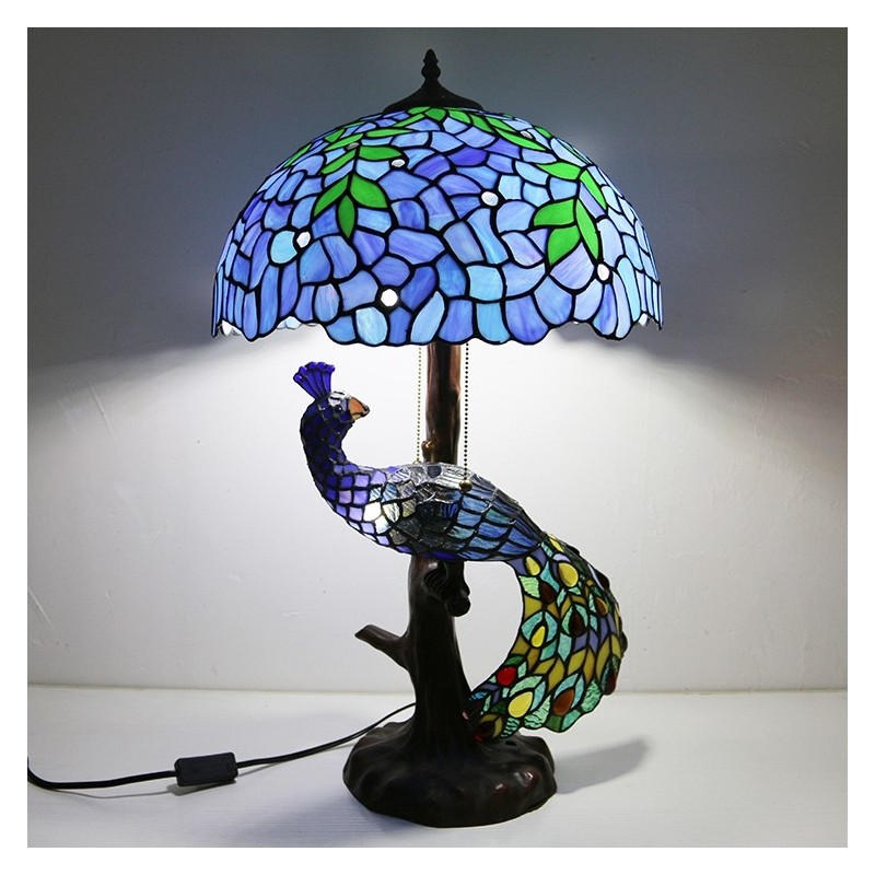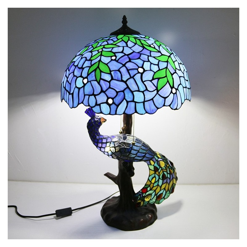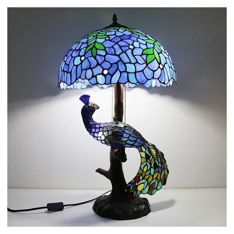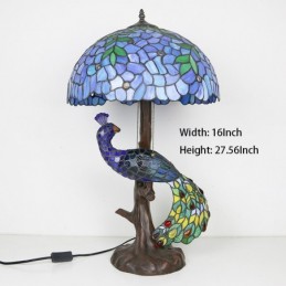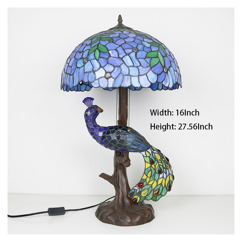 Tiffany vitrāžu rakstāmgalda lampa 16 collu plata, rokām darināta lapu lampa ar pāva un koka pamatni
