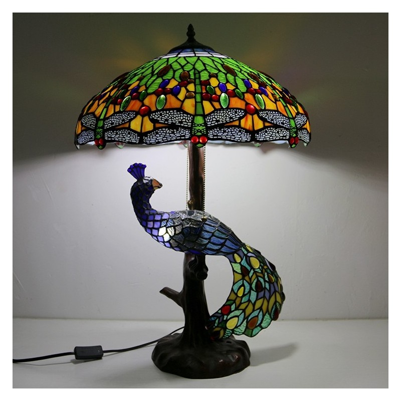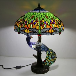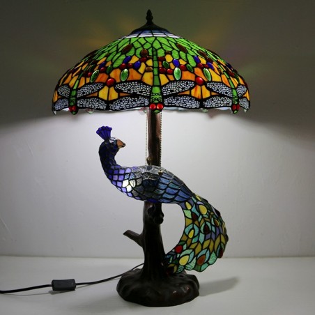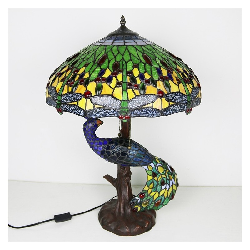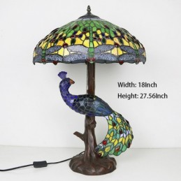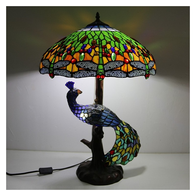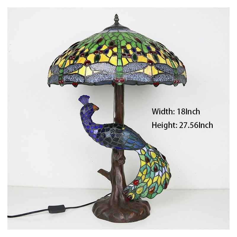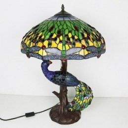 Blue Dragonfly vitrāžas lampas galda lampa Tiffany stila galda lampa ar stikla pāva un koka pamatni