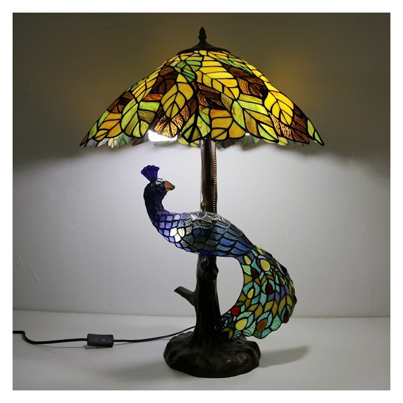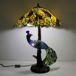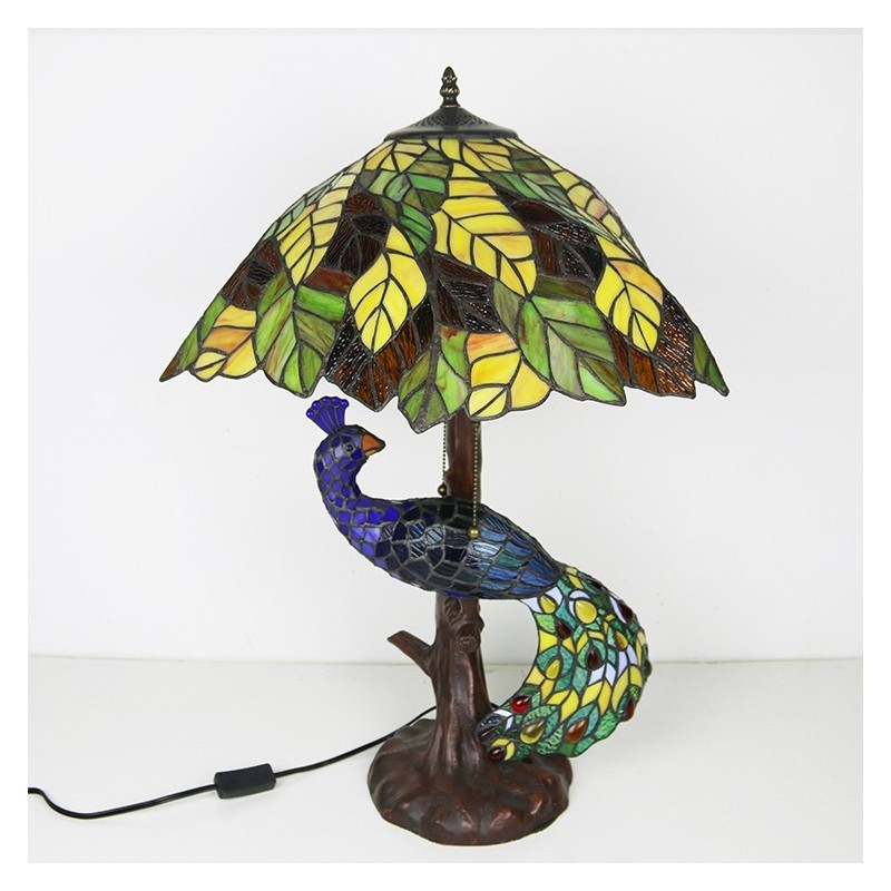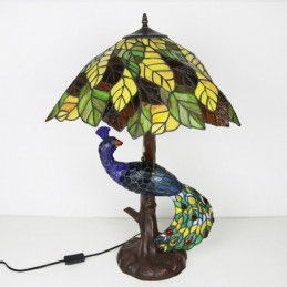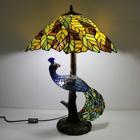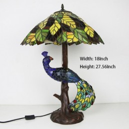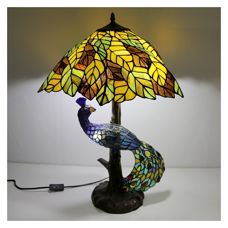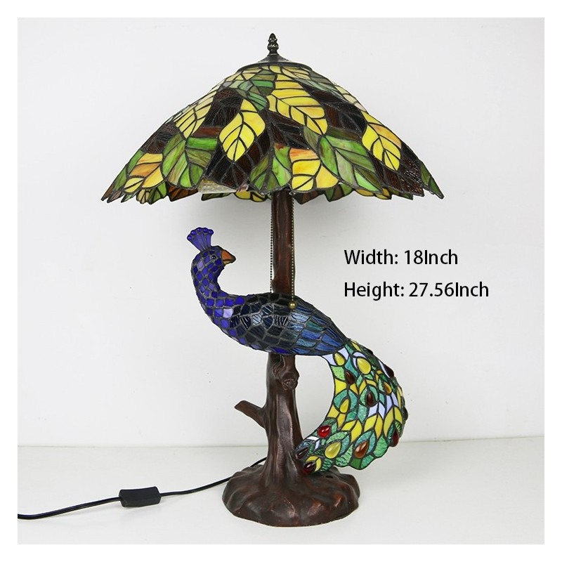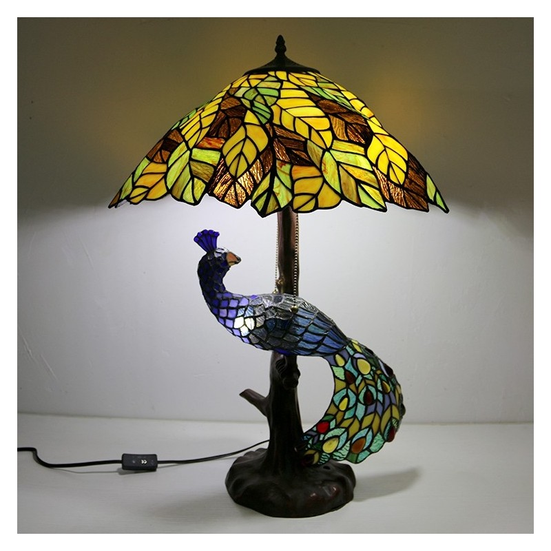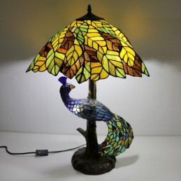 Dzeltenu lapu vitrāžas lampas galda lampa Tiffany stila galda lampa ar stikla pāva un koka pamatni