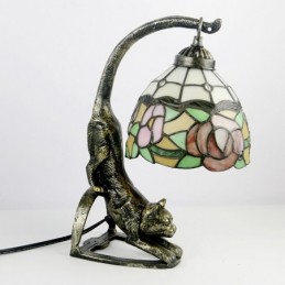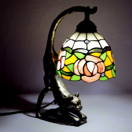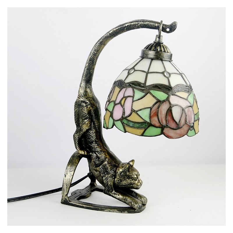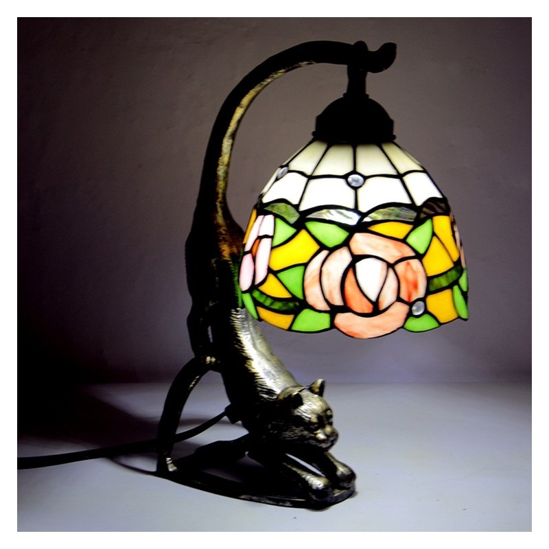 Tiffany stila galda lampa rozā vitrāžas naktslampa ar kaķa pamatni, 15 collu augsta, antīka