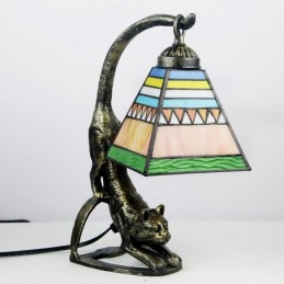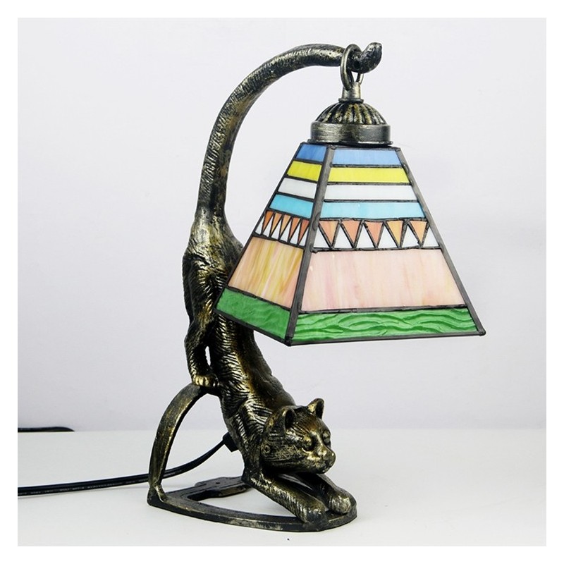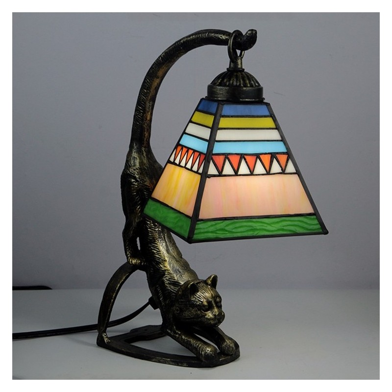 Tiffany stila galda lampa Kvadrātveida vitrāžas naktslampa ar kaķa pamatni, 15 collu augsts, antīks