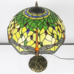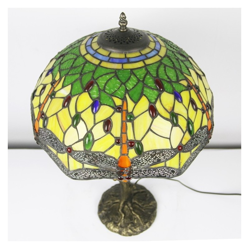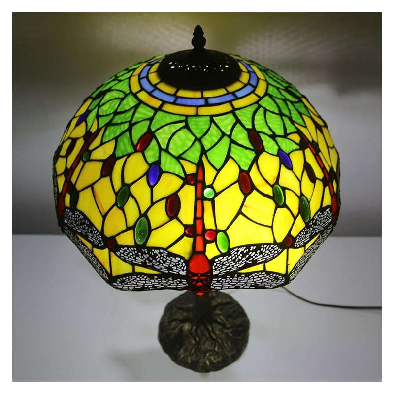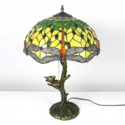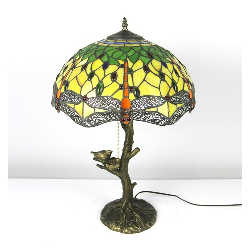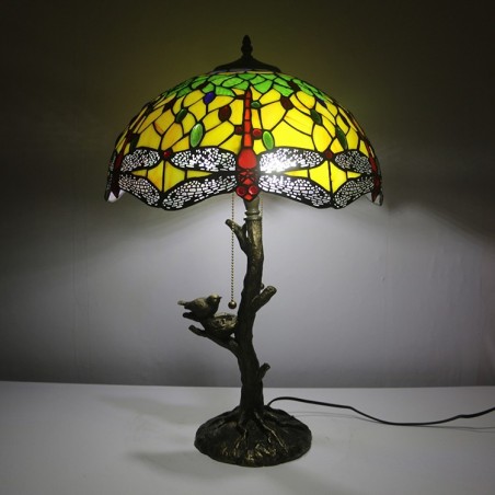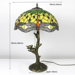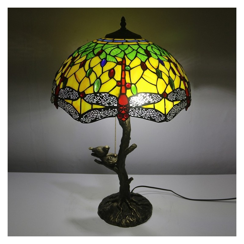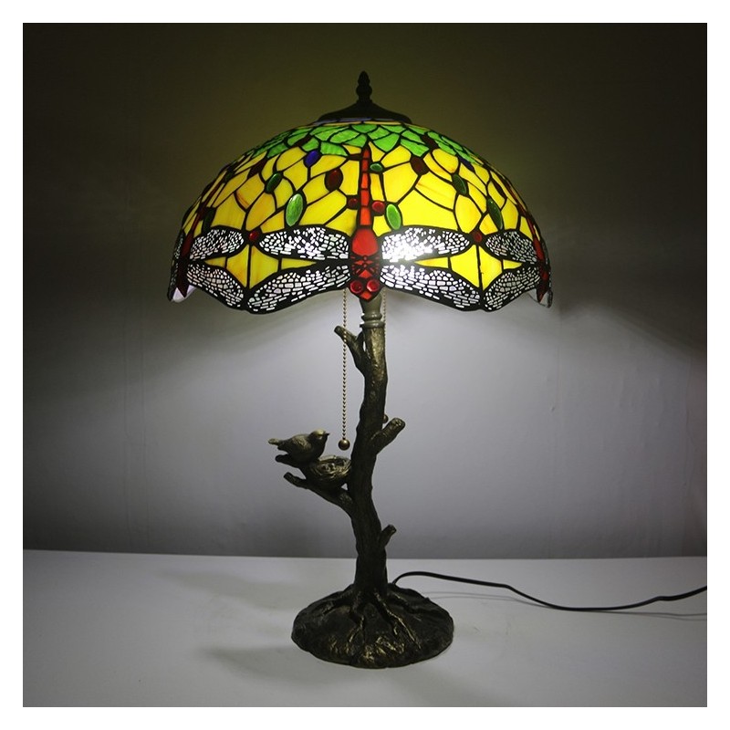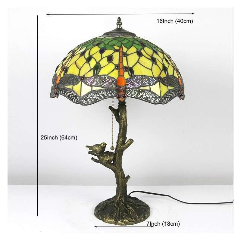 Red Dragonfly Tiffany stila vitrāžas galda lampa ar 16 collu platu lampu un putnu ligzdas koka stumbru